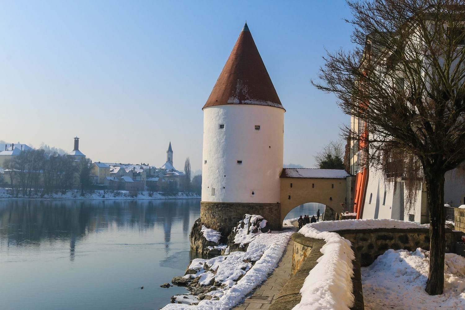 Nothing like a good sleep to give a fresher perspective on life. Up at 07:30 feeling more like a human being. Jet lag is the bane of travellers. A bit slow but not half dead. Had showers all round and that felt so good! Breakfast in the hotel in a cute and comfortable country dining room. Full of low talkers. American style buffet with scrambled eggs and cold cuts galore, cheese, yogurt and even green tea. A delicious repast. Rearranged the car from its claustrophobic parking space so exiting tomorrow on our trip to Wurzburg would be stress reduced. After that arrangement met Andrew and Fotini in the lobby and off the happy tourists went to discover Passau which is a gorgeous little town full of small winding streets the town being nestled between the Donau and Inns Rivers. Started at St. Stephan Church a very lavish church with its bare pillars representing boring human life with angels and saints near the ceiling acting as intermediaries between God and humans. Many tour groups including elderly polyester suited Americans. Next was the Neue Bischofrsidendz, The New Bishops Residence with a spectacular staircase with engraved marble throughout. The Altes Rathaus was the townhall with meeting rooms with opulent wood and gilded ceilings. Then the Veste Oberhaus a former castle turned museum with the history of Passau once a fiefdom of bishops that saw their power gradually erode. Took a break at Café Burg outside the Oberhaus where I had a Weiss Bier (wheat beer) with notes of cinnamon and cloves. Not a fan. Fotini and Andrew had eiskafe. We crossed the bridge and walked along the Inn River to the Schaiblingstram Tower built in 1841. There were many men drinking beer in the park.