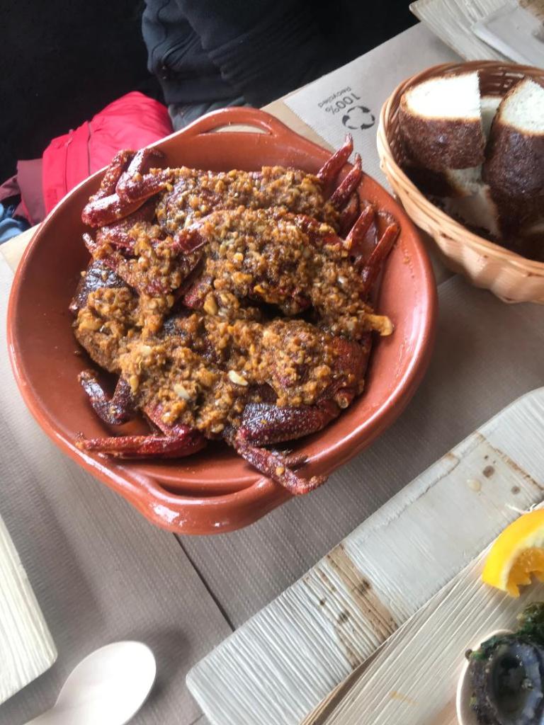 Pico Island cheese to start then sausages including a blood sausage. Limpets freshy scraped off the rocks in the morning followed. Crabs in a spicy garlic sauce next.
