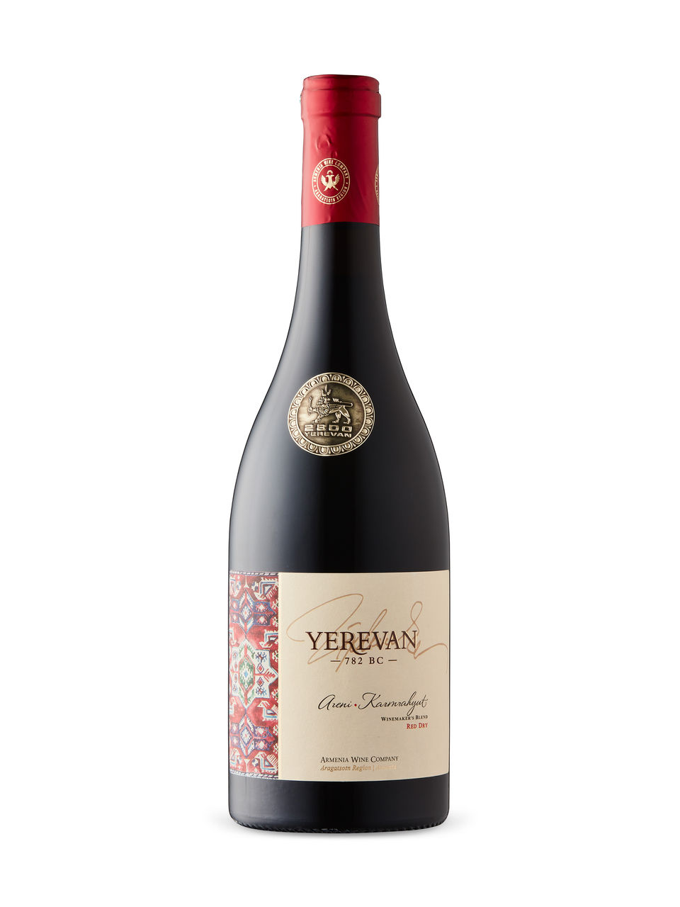 (Yerevan 782 B.C. Areni/Kamrahyut 2023 Red Blend Winemaker’s Blend, Armenia Wine Company, Sasunik Village, Armenia, 750 mL, 13%).