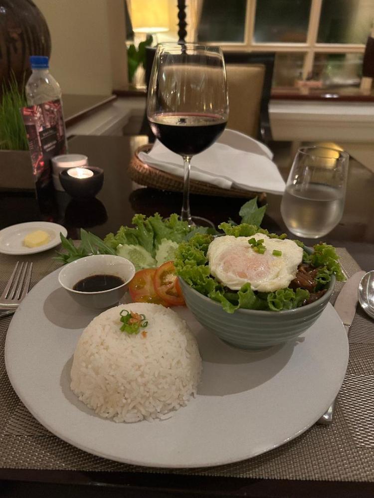 A late dinner at the restaurant at Sofitel for Cambodian Beef Lok Nok and rice (of course) on the side. Cambodian men eat 250 kilos of rice a year and women 190! Excellent and complimented perfectly with a glass of Chilean Cabernet Sauvignon. Watched a terrible Ringo Starr concert on a really poor large screen television.